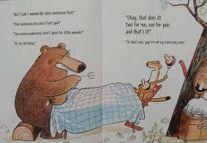 but at the table, Bear lays claim to the extra one on account of her bulk; Weasel counters that with a demand for mushroom number three saying, “I’m small, and I still have to grow”