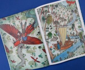 Wheels are turned and buttons pressed whereupon tropical plants appear from what look like vintage gramophone horns and morph into a fully-fledged tropical jungle wherein lush fruits abound. A huge bird descends to take the children flying before dropping them beside a winding river where a sailing boat awaits.