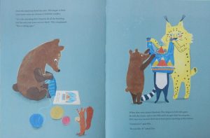 Comic timing combined with droll mixed media scenes of the escalating situation (I love the forest setting with the kitchen set-up) make for a fun way to introduce youngsters to the notion of sharing: how might they solve the ‘afters’ issue?