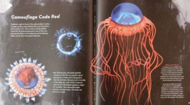 I was totally fascinated to read about the atolla jellyfish, in particular Atolla wyvillei a species of crown jellyfish, and the way in which it uses bioluminescence, flashing first blue and then red, the latter being invisible in the deep sea and thus acting as a protective mechanism.