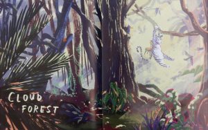 We then accompany a black and white tiger through a series of lush landscapes on a solitary journey that takes him with the chair now strapped to his back, through a gorge, a valley, across a plain, through a cloud forest,