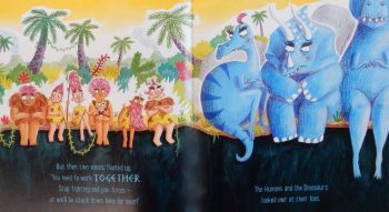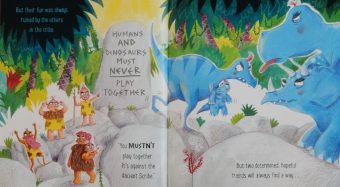 One day though, one little human, Pearl by name and one little dinosaur, Dexter, both decide to take a walk and they bump into one another – literally! Surprisingly they get on well and before long have become besties – ‘a Human-Dino team’ no less. Needless to say this incurs the wrath of their respective tribes.