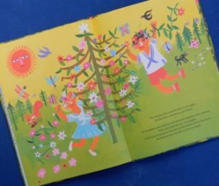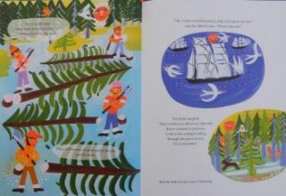 Christopher’s characteristic dazzling folk art style illustrations follow the little fir tree from its place deep in the forest where it stands feeling discontented with its lot, as other, bigger trees around are felled. Learning that they are to be used to build cabins and ships, the tree insists it too wants to “become a ship and sail on the sea.”