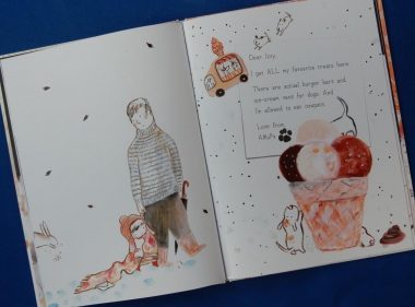 This is a totally adorable book despite the sadness of its themes – coping with death and finding a way to express loss. The death is of the beloved pet dog Alfie, now in Dog Heaven.