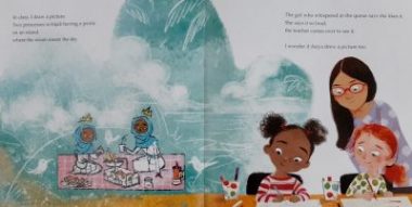 Once at school however, the comments from other children start. These are alternated with meditative spreads showing and telling of Faizah’s thoughts about her sister’s hijab, along with Mama’s words.