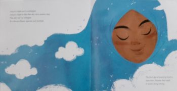 The following morning the sisters leave for school, Faizah (the narrator) sporting snazzy new trainers and wearing a new backpack, Asiya wearing her brightest blue hijab that reminds her sister of the colour of the ocean, if you squint your eyes and pretend there’s no line between the water and the sky. “I’m walking with a princess” Faizah tells us and “Her hijab smiles at me the whole way.”