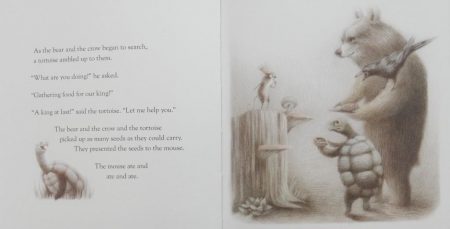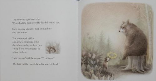 The mouse dons the crown; it fits perfectly and very soon a bear comes along. “Are you a king?” he asks. The mouse considers briefly before replying in the affirmative. “Hail to the king!” comes the bear’s response.