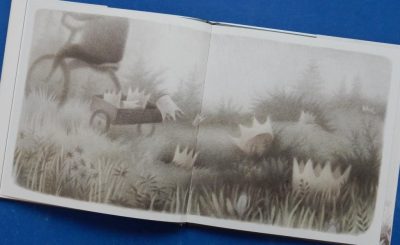 Turning the page reveals a just woken hungry mouse discovering not food but a tiny crown in the grass.