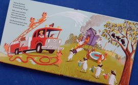 Each of Migy Blanco’s jolly digital spreads shows the farmer and his animals joyfully dashing around in one or more of the vehicles, before the two penultimate tongue-twisting spreads, before the 50’s-looking vehicles whizz towards the finish line. If you can actually slow down though, there’s plenty to pore over in every scene.