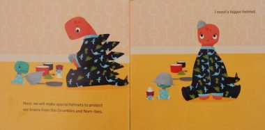 Tiny T. Rex and his buddy Pointy are spending their very first night under the stars, and the adorable dinosaur narrator, all the while clutching tight his squishy bear Bob, regales us with their nocturnal experiences. When outside, we hear, ‘the dark is VERY dark’ and with no ‘nighty-lights to turn on’ there may very well be Grumbles and Nom-bies at large.