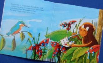 It’s a neo pourquoi tale delivered in jaunty rhyme that certainly packs a punch. It tells how long ago a monkey, inspired by the rainbow colours of the birds, takes up the paintbox he happens upon beside the stream, along with a couple of brushes, and feeling an upsurge in his creative juices, sets to work to make his world a brighter place.