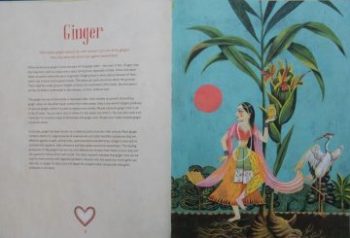 However as a frequent visitor to India, I was instantly attracted to the “ginger’ illustration with its stylised dancer reminiscent of Indian miniatures. We read of ginger’s origins in India, China and other parts of Asia and of its many uses in cooking, in drinks and as a medicinal plant. Perhaps you didn’t know (I certainly not even considered it)) that in addition to its many healing benefits for humans, ginger root can be used to treat horses and other animals.