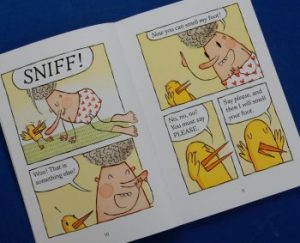 Without further ado let me introduce its comedic duo: Chick is the pedantic, manners obsessed one; The socially inept Brain, despite appearances, can’t quite get the hang of such niceities as ‘please’ and ‘thank you’ and simple greetings, despite Chick’s modelling them for him. Instead of copying, his response is direct action. For instance Chick says, “ But I will not smell your foot until you say PLEASE.’ … ‘Like this ; please smell my foot.’ ‘Oh! OK!’ comes Brain’s response followed immediately by …