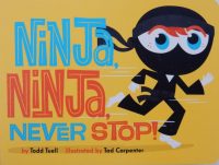 There’s a slight retro feel to Tad Carpenter’s bold, bright scenes from which the black-clad Ninja leaps out – literally! I can see little ones joining in, enthusiastically chanting along with adult readers aloud of debut author, Todd Tuell’s staccato text, as they turn the pages.