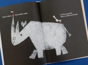 It begins ‘just in case you want to fly, here’s some wind / and here’s the sky’ going on in rhythmic rhyme to provide such uplifting words about potential needs as ‘here’s a cherry if you need a snack/ and if you get itchy / here’s a scratch on the back’