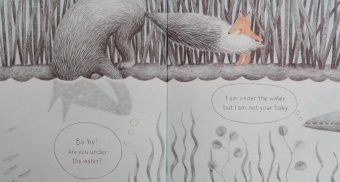 There’s so much to love about this hide-and-seek book: the dramatic irony of the whole tale; the entirely speech bubble text with its question and answer format; Anne Hunter’s superb, finely drawn pen and pencil, cross-hatched illustrations with that limited colour palette that grace every spread, the fact that youngsters will perceive that Mama Fox is playing along with her offspring and the unobtrusive lesson in prepositions.