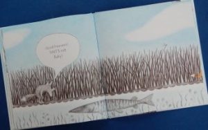 In this delightfully playful book whose story really begins on the front endpapers, Papa Fox searches for his little one. “Have you seen Baby, Mama Fox?” he asks on the first page and the response, “Why, Baby must be somewhere, Papa Fox” leads the male parent off, walking stick in paw, searching high and low in the countryside – up in the tree, inside a log, over the hill, down a hole, under the water and around the bend.