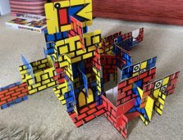 The kit comprises 64 cleverly designed, slot-together building cards (105 x 69mm) – turrets, arrow-slit windows, portcullises, roofs, walls, flags and other things which can be assembled both upwards and outwards, to create a medieval wonder, or many.