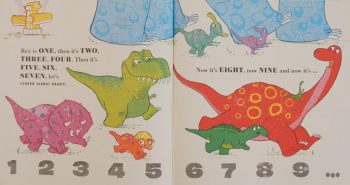 However no matter how hard you try and how good your one to one correspondence is, by the time you reach the final spread, you won’t get ten dinosaurs (unless of course you want to count in the one in a certain Rex’s enormous belly. No wonder the author chose to call his stomping romp You Can’t Count on Dinosaurs.