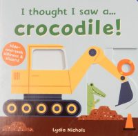 Using the slider mechanism on every spread, little ones can engage in a game of hunt-the croc. as they listen to the repeat “I thought I saw a crocodile … Is it …?’ spoken by other members of the crew at the building site.