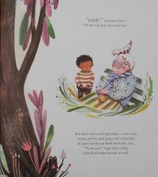 Gradually during their search Sami finds that the people he’d previously thought of as standoffish are quite the opposite. The old lady from the bus no longer scowls; rather she smiles offering Sami grain to feed the birds.