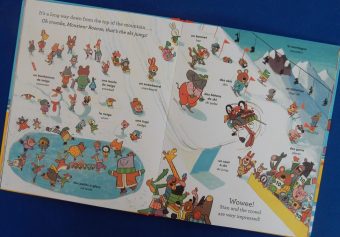 and there’s even a seek-and-find element to the whole thing, for on the final page are lists of items to spot at the six locations featured.