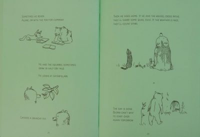 Nothing much happens in a certain bear’s life but he’s never bored. The thing is, he’s a contemplative soul and is perfectly happy sitting watching life, playing the odd game of cards with a pal, eating, napping, reading (of course) and doing an occasional drawing in the mud.