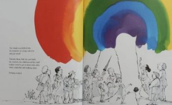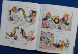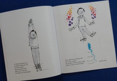 Suddenly this thank you turns into something colourful, full of energy and movement. Out the front door it whizzes and off down the road, followed by his parents, the post lady whose smile makes the thank you ‘grow and glow’, all the way to school where’s it’s given further sparkle from the teacher’s eyes. Then off into the market it goes, with everyone touched by it in pursuit, spreading joy and colour till it reaches a massive oak tree. And there among the branches it sticks.