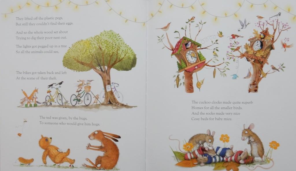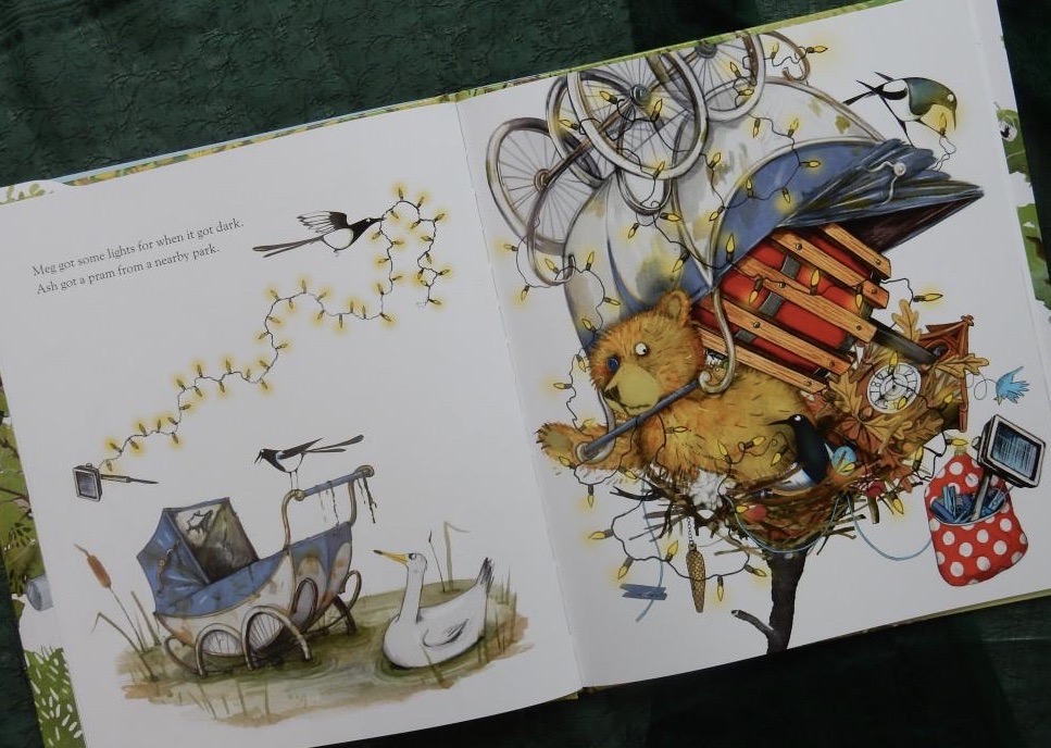 From the ground below the forest creatures watch in astonishment (as do readers and listeners) as Meg and Ash take turns to collect items that their chicks are ‘really going to NEED.’ Really?