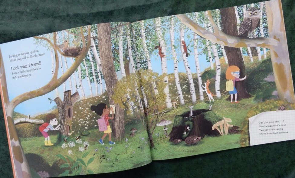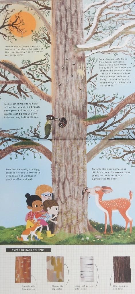 The second spread shows the children making observations while the text provides facts about the trees and a sidebar showing labelled tree shapes.