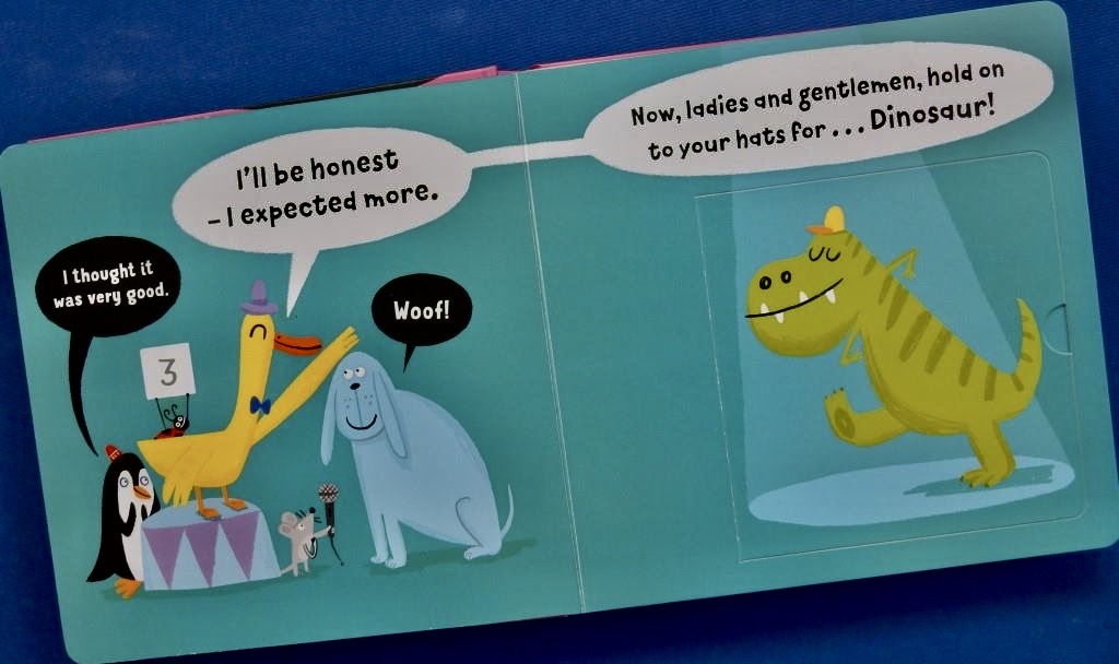 Who will be the winner of the Best Roar in Town contest? With a dapper duck as compere, the animals take turns to let loose their most fearsome roars. There’s Mouse who receives faint praise; Penguin – not overly impressive; Dog – definitely an underwhelming performance and then comes Dinosaur.