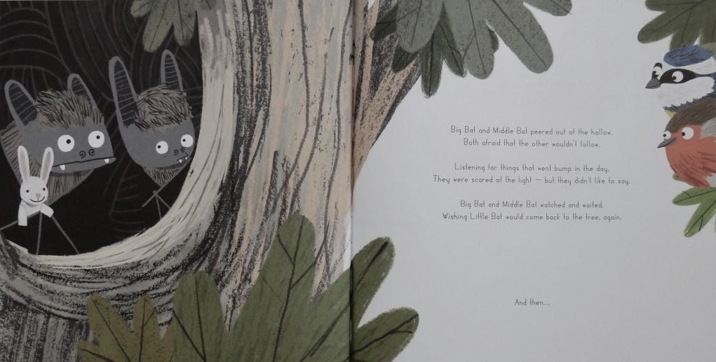 Absolutely bat-tastic sums up my response to this book. It had me hooked from the opening lines, so poetically describing the coming of morning to the Dark, Dark Wood. A wood where, in an old oak, dangle Big Bat, Middle Bat and Little Bat, snuggled up and ready for rest and perhaps some inverted dreams.