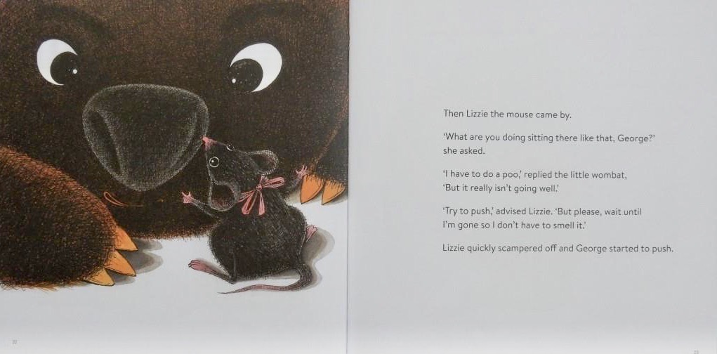 Pooing in his potty is what his mum has told the little creature he must do before he can go into the forest and dig a burrow. Being an obedient marsupial, George goes and sits on his potty but sitting on your lonesome upon your potty (or otherwise) is more than a little boring.