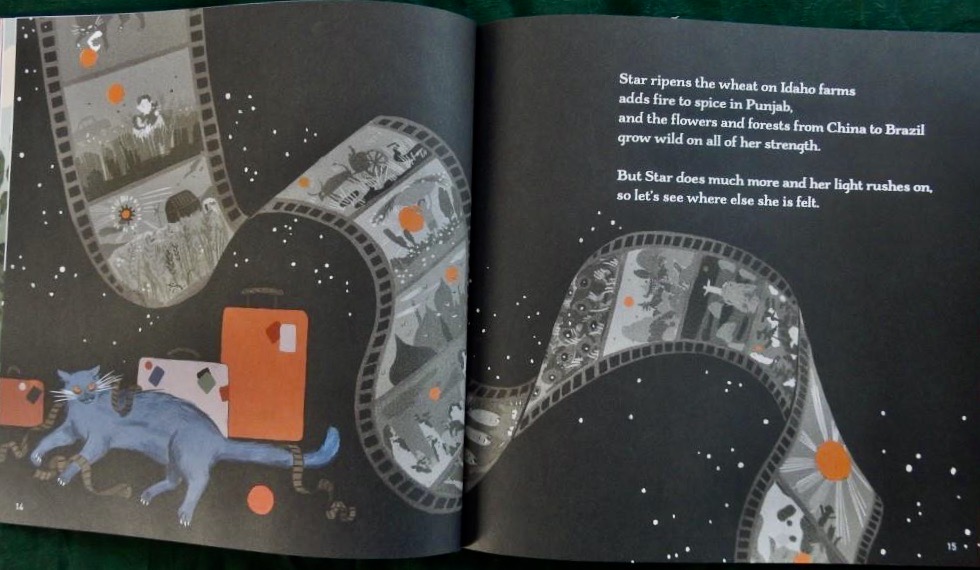 I love the way in which both poet author Conlon’s lyrical language and illustrator Izlesou’s atmospheric art both focus on this single star of ours, turning the otherwise ordinary into the truly extraordinary: truly a painting of words and pictures. Or rather a series of paintings that remind us of how our Earth moves around our Star and what that means for different environments; or shows the gradual change from day to night,