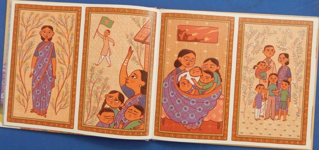 To begin with she shows readers a purple and blue quilt and we learn of Bora Khala’s medal from the war represented by the circular patterns on the fabrics. These help recall a sad time when he had to leave his wife alone with the children, to return after many years.