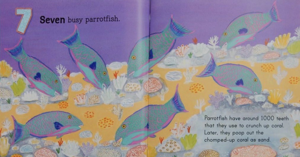 First we encounter one giant whale shark and discover that some of their kind can grow as long as a bus. Then, in a double spread each, come two dugongs, three playful clownfish … parrotfish (7) which young children will love to discover, use their sharp teeth to ‘crunch up coral’ and later ‘poop out the chomped-up coral as sand.’