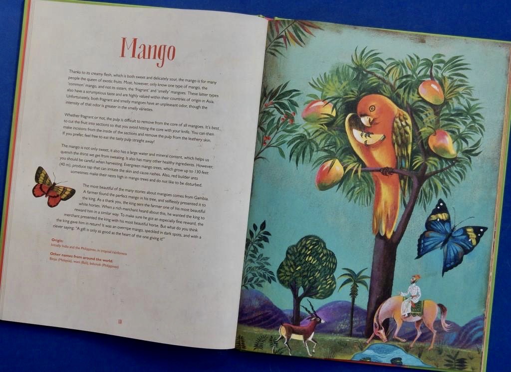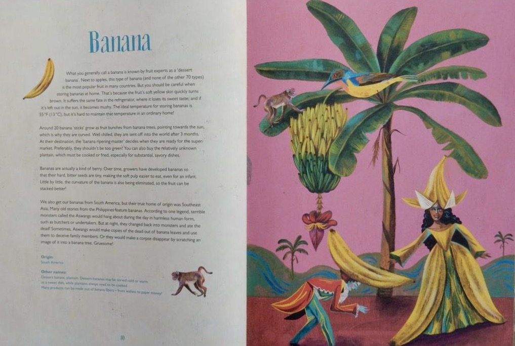 No matter where you open the book, opposite the illustration is an engaging page of text by Annette Roeder. This provides straightforward factual information drawn from history as well as modern times; there’s often some folklore, or perhaps a truncated myth or traditional fairytale. The final spread entitled ‘A colourful fruit salad fairy tale’ has a story so the author says, whispered to her by a woman in a shop about a spoiled prince and pineapples that grow wings so he can consume them at their perfect stage of ripeness; and there’s information about choosing wisely when it comes to selecting what to include in your own fruit salad.