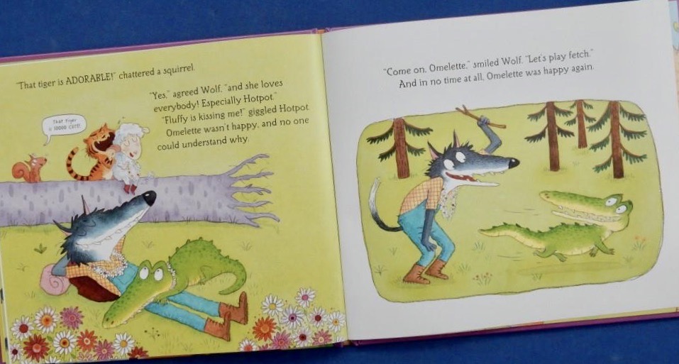 In this fourth story to feature Wolf, Hotpot the lamb and their crocodile, Omelette, the friends are playing their favourite game of fetch when instead of a stick, Omelette brings back a tiny, soggy lost tiger. Hotpot is keen to keep the little thing but Wolf shakes his head “ … little tiger’s family must live further up the river. We have to take her home,” he says.