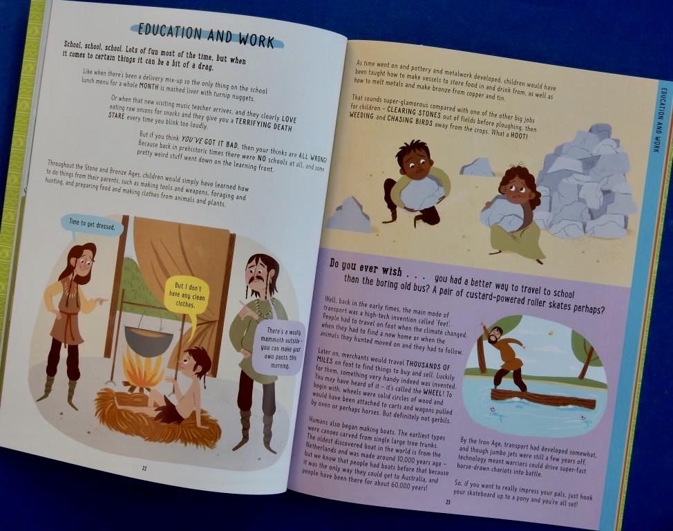 With sections on hair and clothing, the home, education and work, health and medicine (you might have been subjected to trepanning – the drilling of a hole into your skull to release the evil spirits causing your problem), religion and gods, myths and legends, fun and games (yes there were some occasionally) and finally, the beginnings of written history, each one brought to life by Marisa Morea’s amusing illustrations, this book presents information in a manner that’s both accessible and entertaining.