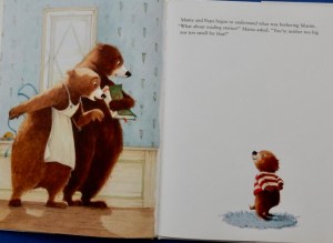 Where his parents are concerned, little bear, Martin just can’t win with his actions. “Don’t be silly, Martin” says Mama when the cub sees his baby sister drinking from a bottle and asks for a bottle, too – “you’re far too big for a bottle!” (Is she aware of sibling jealousy one wonders.) Shortly after when the cub tries using a knife to cut his food, she insists on doing it for him. (Why not show him how to help himself?).