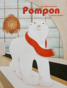 The titular Pompon is a large white bear statue in a museum, a statue that fascinates young Leo when he visits one day. Mesmerised Leo stands staring for ages, taking in its shape and enormity, its smooth texture and the curve of its ears. (This we see in Joanna Boillat’s close-ups that extend over half a dozen spreads.) Now Leo has a special magical look in his eyes and cannot resist reaching up and stroking Pompon’s cheek. The museum guard, initially angry,