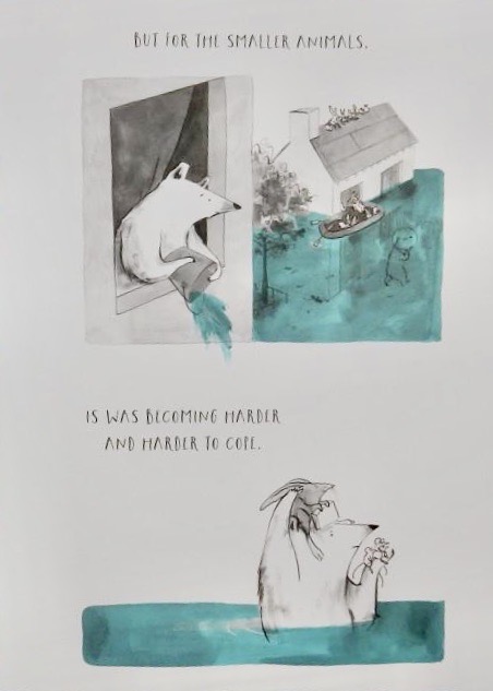 Full of water, wit and a little one’s bit of wisdom is this debut picture book from Mariajo Ilustrajo, about a city inhabited solely by animals. It happens one summer beginning on a day just like all the others except that the entire place is rather wet. Initially all the residents except one are happy to use the excess of water as a chance to splash about in wellies and carry on with life as normal, merely making it a topic of conversation and a source of fun.