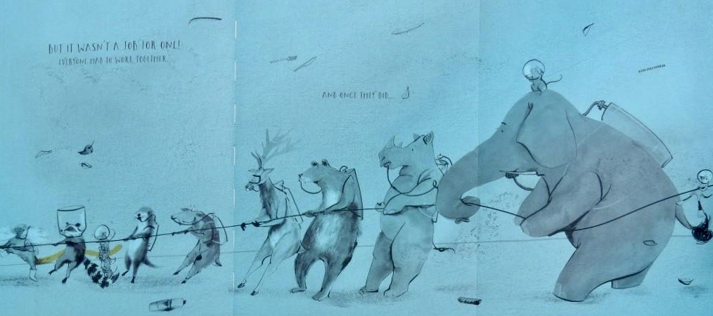 This tale of pulling together in times of need is wonderfully illustrated by an exciting newcomer using ink and graphite and digitally coloured. The text is kept to a minimum allowing the wealth of funny details in each scene to do much of the storytelling.