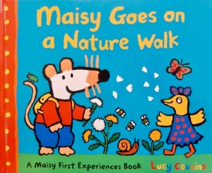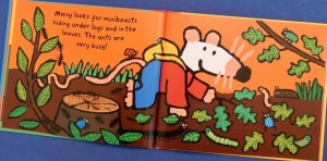 With her bag duly packed, Maisy meets her friends Tallulah , Charley, Cyril and Eddie for a nature walk in the park. There’s lots to see such as dragonflies flitting above and in which tadpoles and fish swim; woodland animals peeping out from between the trees, many of which are filled with noisy birds. Maisy gets close to the earth to hunt for minibeasts …