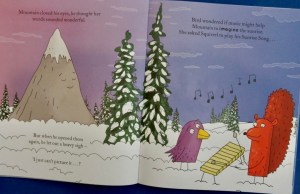 Although the hills around Mountain receive the sun’s rays each morning, because the sun always rises behind him, his face stays in the shade. So much does he long to feel sun’s beaming warmth that he tells Bird he wishes he were able to turn around. Bird flies off to seek help from Bear and the two of them push with all their might but Mountain remains firmly as he was.