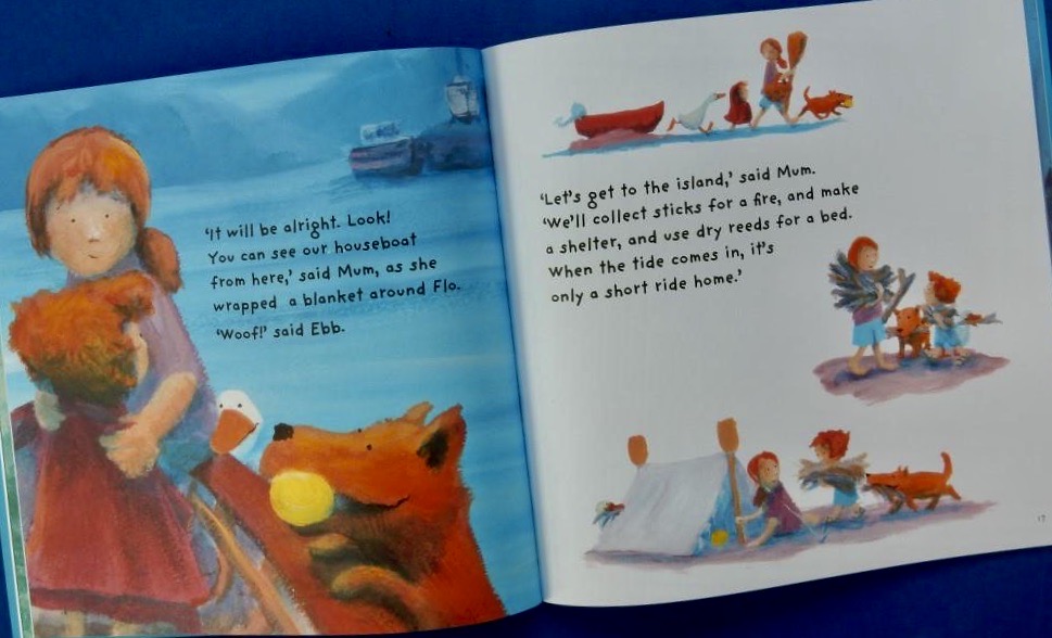 As Flo sits with Granny sharing a local paper and focussing on a picture of Morgawr the mythical sea monster, Ebb’s ball bounces away and so begins this wonderful moonlit adventure as they search for the ball which goes overboard on their way home across the bay, and perhaps for a sighting of Morgawr too. But they find themselves marooned and have to camp put on the beach.