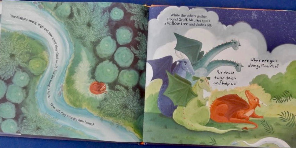 As the storm clouds gather and it’s time for the competition’s final round – the gold treasure hunt – Maurice wants to delay, but brother Gruff is determined to defend his title immediately and off he soars into he clouds. However the storm continues to rage and the other dragons start to worry about Gruff’s failure to return. Maurice ponders and puts forward an idea. Can it possibly work though? To his fellow dragons, he doesn’t appear to be doing very much to help his injured sibling.