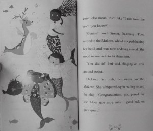 Almost the next moment Aziza finds herself on the crowded sandy beach where amidst the masses she sees first the Gigglers creating a drama as always, then at the edge of the shore Peri and Tiko and sitting close by on the rocks, a mermaid. The mermaid introduces herself as Sirena and Aziza is hugely impressed when she hears of some of Sirena’s adventures. Suddenly as they chat the ground begins to shake; Aziza fears it’s an earthquake but her new friend assures her it’s a shell-walker sneezing in its sleep deep underground. But when ice-creams and picnic baskets start flying around, the possibility is that the creature is not asleep but about to emerge, grow huge and endanger the whole of Shimmerton. Fortunately Sirena knows of a magic conch shell that plays a song which could just be the answer to their problem.