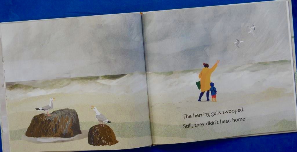 Granny and Bean are out walking on the beach: the sea and the sky are dreary shades of grey and beige, but Granny and Bean are undeterred. Suitably clad in raincoats, warm hats, and boots, the pair make their way along the beach, enjoying their time together. Nothing is going to stop these two making the most of their time together. ‘Their laughter rose. Full of joy, it spilled / ‘cross sand, through mist, / as the curlews trilled.’ As they watch the spotted gulls,