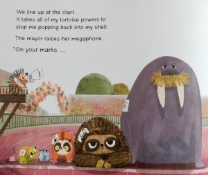 Not so Lorraine’s who encourages her pet saying, “Just run your own race.” Nevertheless come race day the tortoise is a bundle of nerves. Surely all that training isn’t going to be for nothing: Barbara will never find out if she stays in her shell so off they go to the stadium.